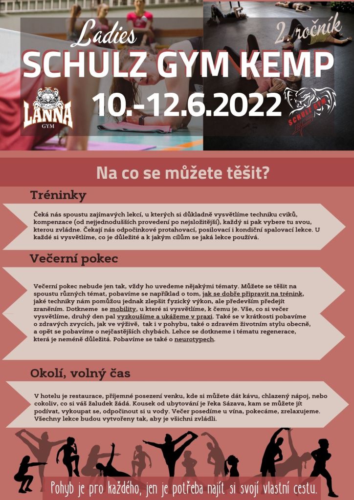 Přicházíme k vám s již druhým ročníkem letního Ladies kempu. Co vás na kempu bude čekat? Zacvičíme si, pověnujeme se spoustě témat, která jsou spjatá se zdravým životním stylem a pomůžeme vám zorientovat se v důležitých informacích ohledně zdraví a zdravého životního stylu. Zároveň se budeme věnovat různým druhům cvičení a budeme hledat pro každého obtížnost, která mu bude vyhovovat pro jeho sportovní cíle.