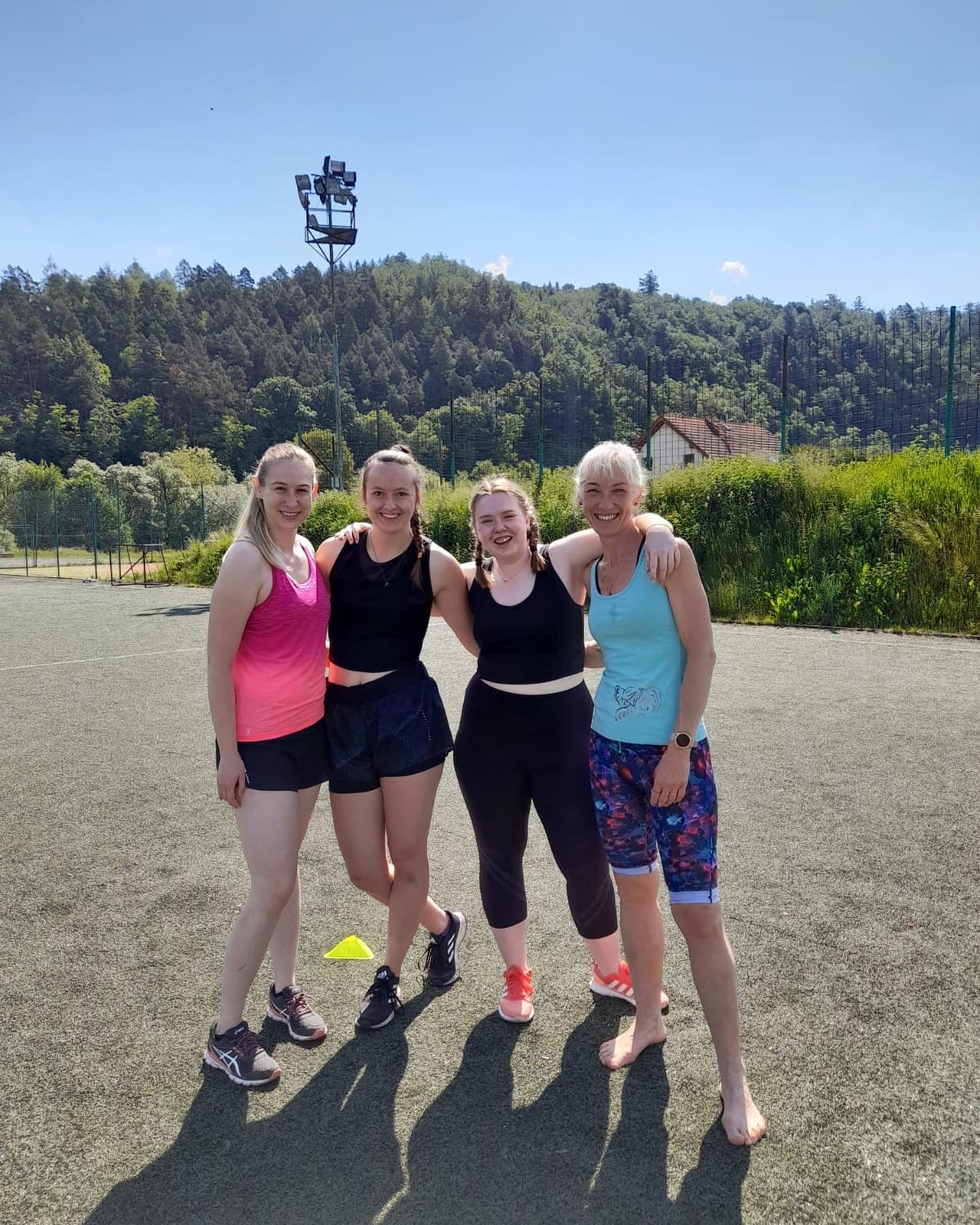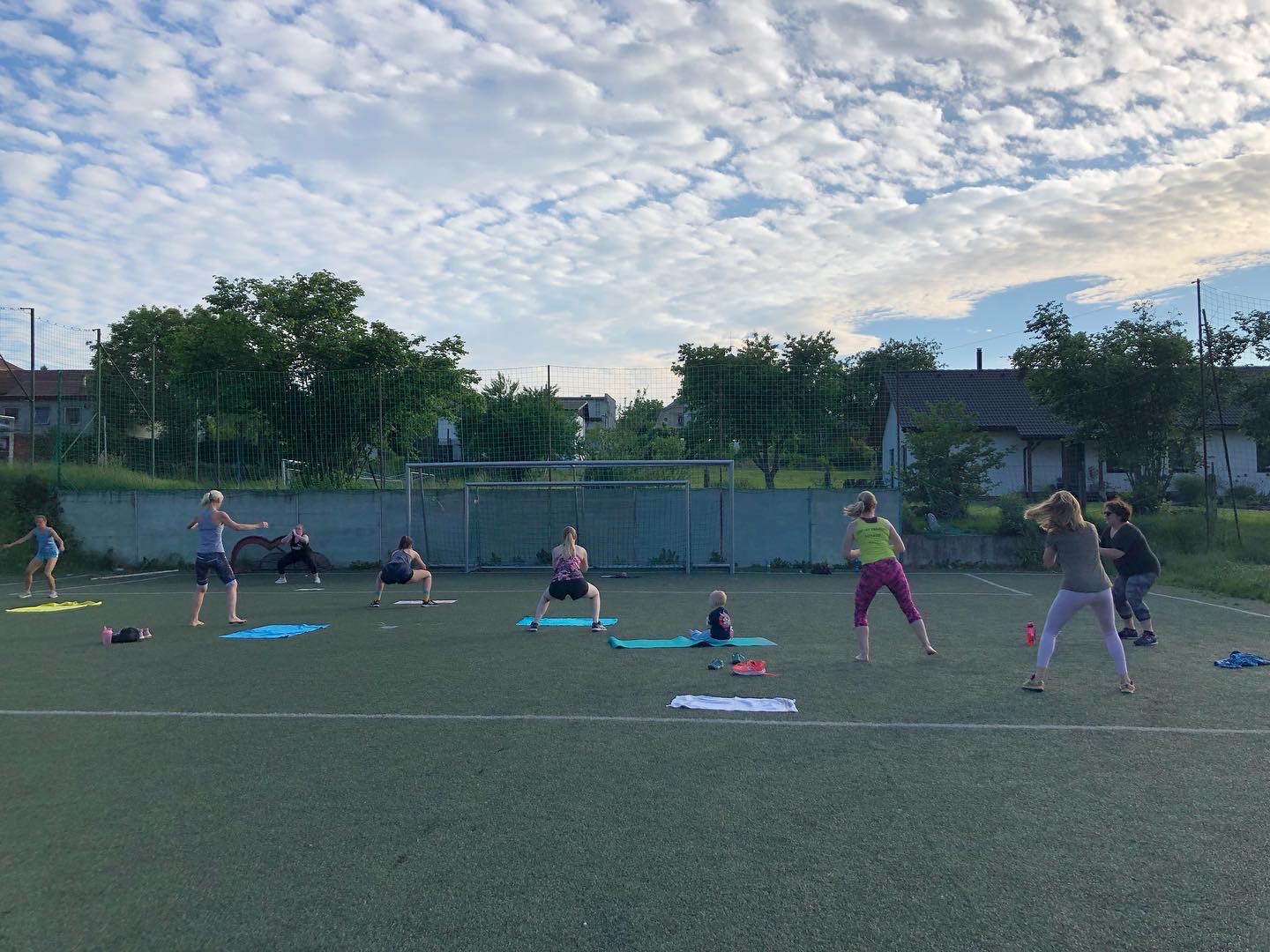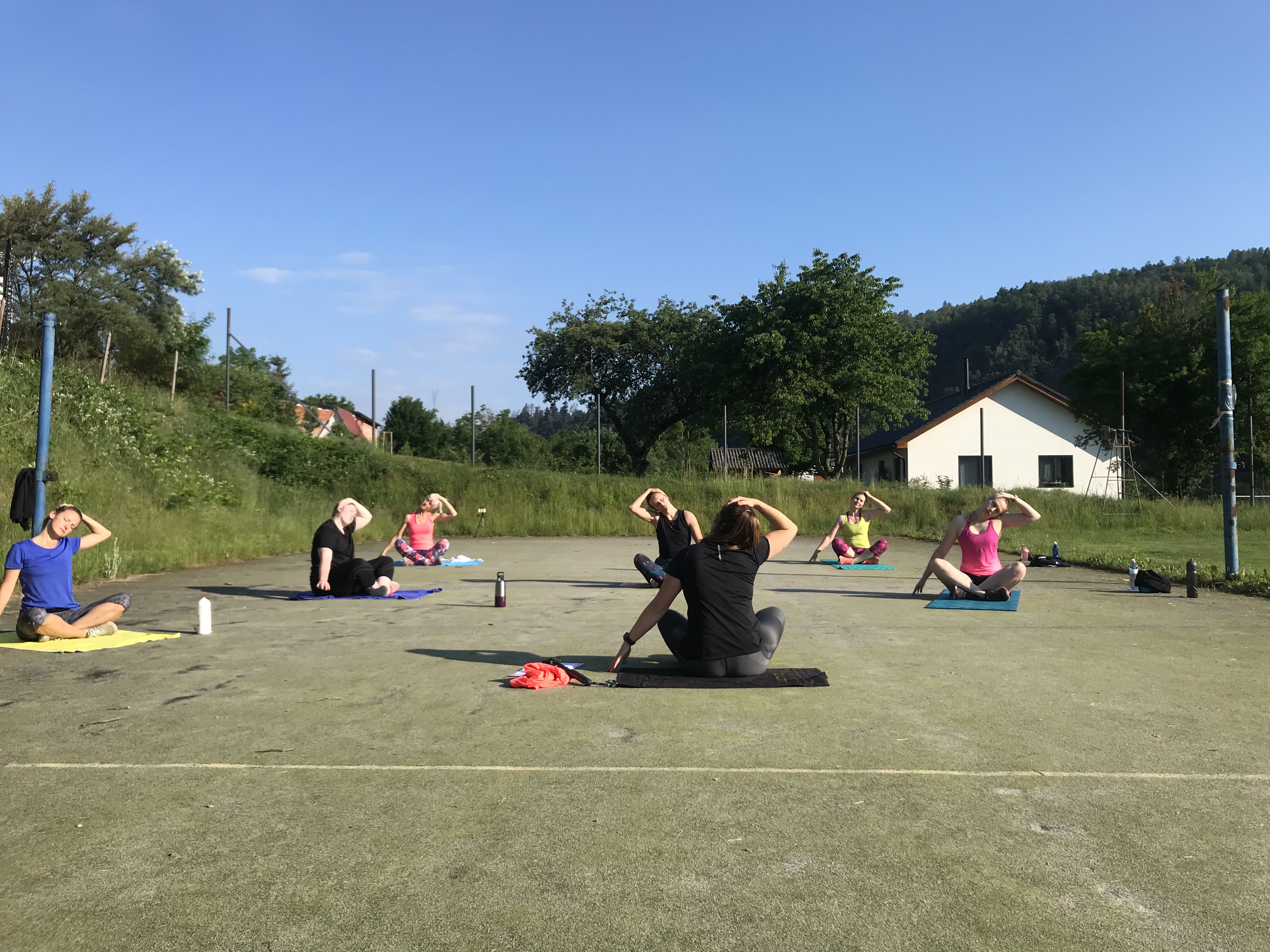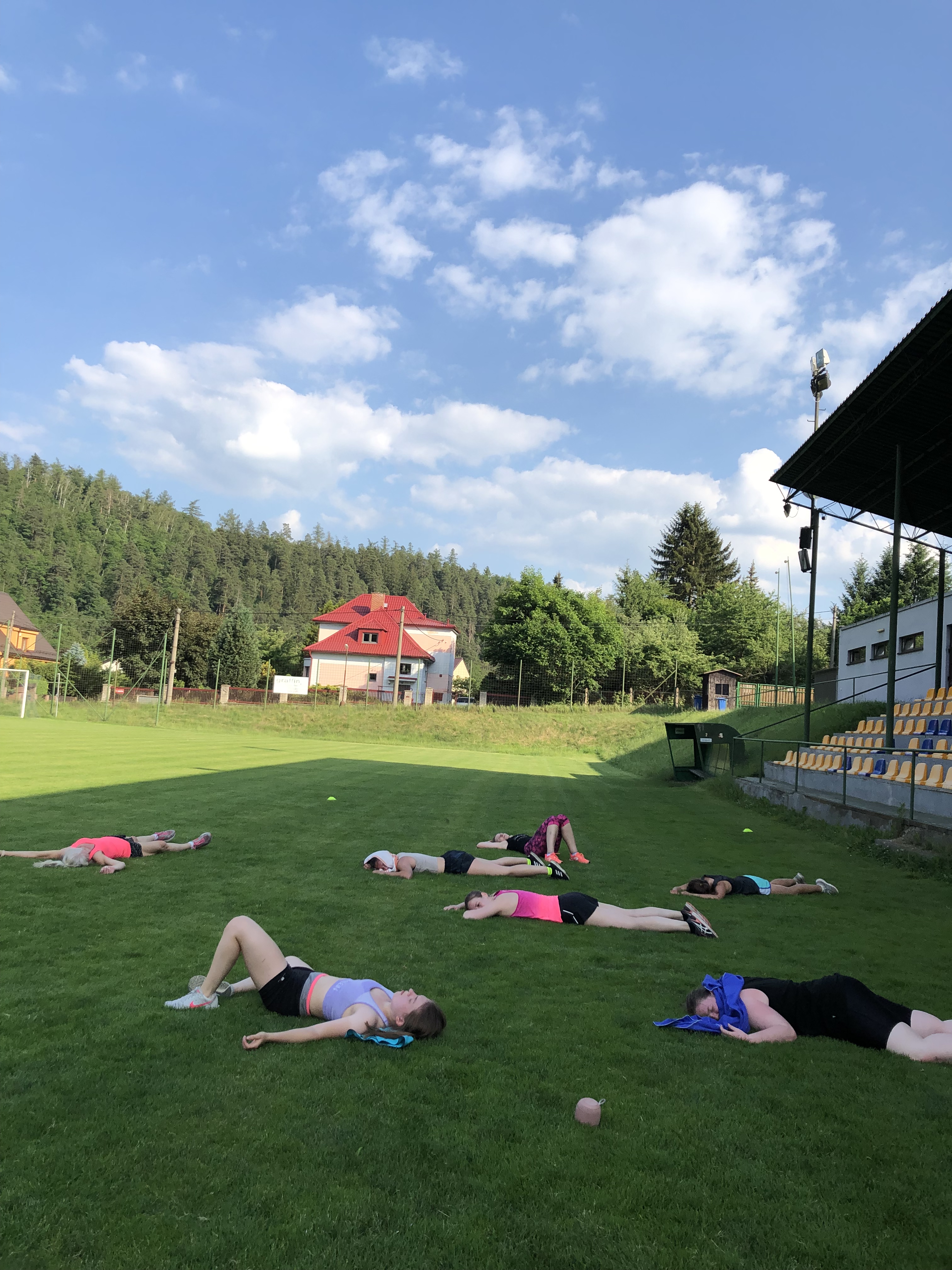 Užily jsme si spoustu tréninků, za celý víkend jsme odcvičily celkem 5 tréninkových jednotek, těžší, lehčí, kratší, delší. Zahájily jsme soustředění večerní lekcí, kdy jsme si zkusily HIIT a LISS cardio na cca 60ti minutové lekci. Každé ráno před snídaní jsme zahajovaly srazem na fotbalovém hřišti, kde jsme si užívaly ranní rosy a ještě né tak horkého počasí. Ranní kratší lekce (30-40min) byla pojata formou regenerace, aby ji na lačno každý zvládl, protáhli jsme se a prokrvily bolavé partie, které povětšinou přestaly bolet. Snídaně probíhaly formou rautu, kde si každá zúčastněná nabrala co má ráda, to je obzvlášť příjemná část dne 🙂 . Před obědem jsme se sešly na hlavní tréninkovou jednotku, která byla nejdelší, trvala cca 75minut. Zahřály jsme se běžeckou abecedou, protáhly a společně prošly 40 minutovým workoutem. Před večeří jsme se sešly na předposlední trénink kempu. Vzhledem k přibývající únavě a bolavým nohám, i přes časté rolování svalů a snaze nacpat do programu co nejvíce regenerace, jsem musela holky trochu namotivovat, protože energie bylo méně a méně, tudíž jsme se zahřály lehkých výběhem, udělaly krátký kruháček na dozahřátí a soutěžily jsme o ceny v hodnotě 1600,-. Vítězky nakonec byly dvě. Holky se neuveřitelně hecovaly a ta atmosféra byla parádní! Každý měl možnost jít podle sebe, buď tam nechat vše a nebo se jen kolektivně zúčastnit. Nakonec se všechny holky dostaly ve workoutu opravdu daleko!
