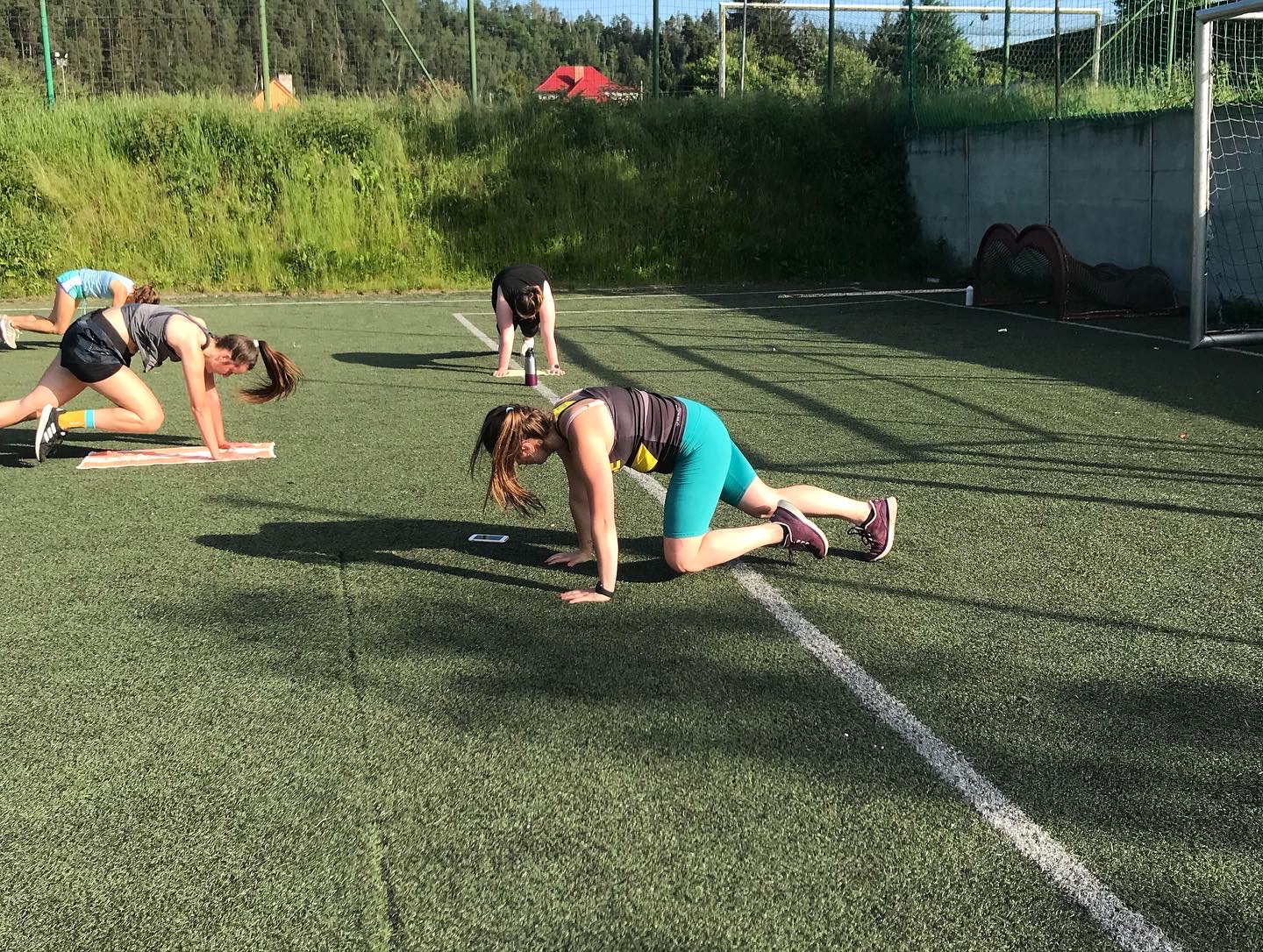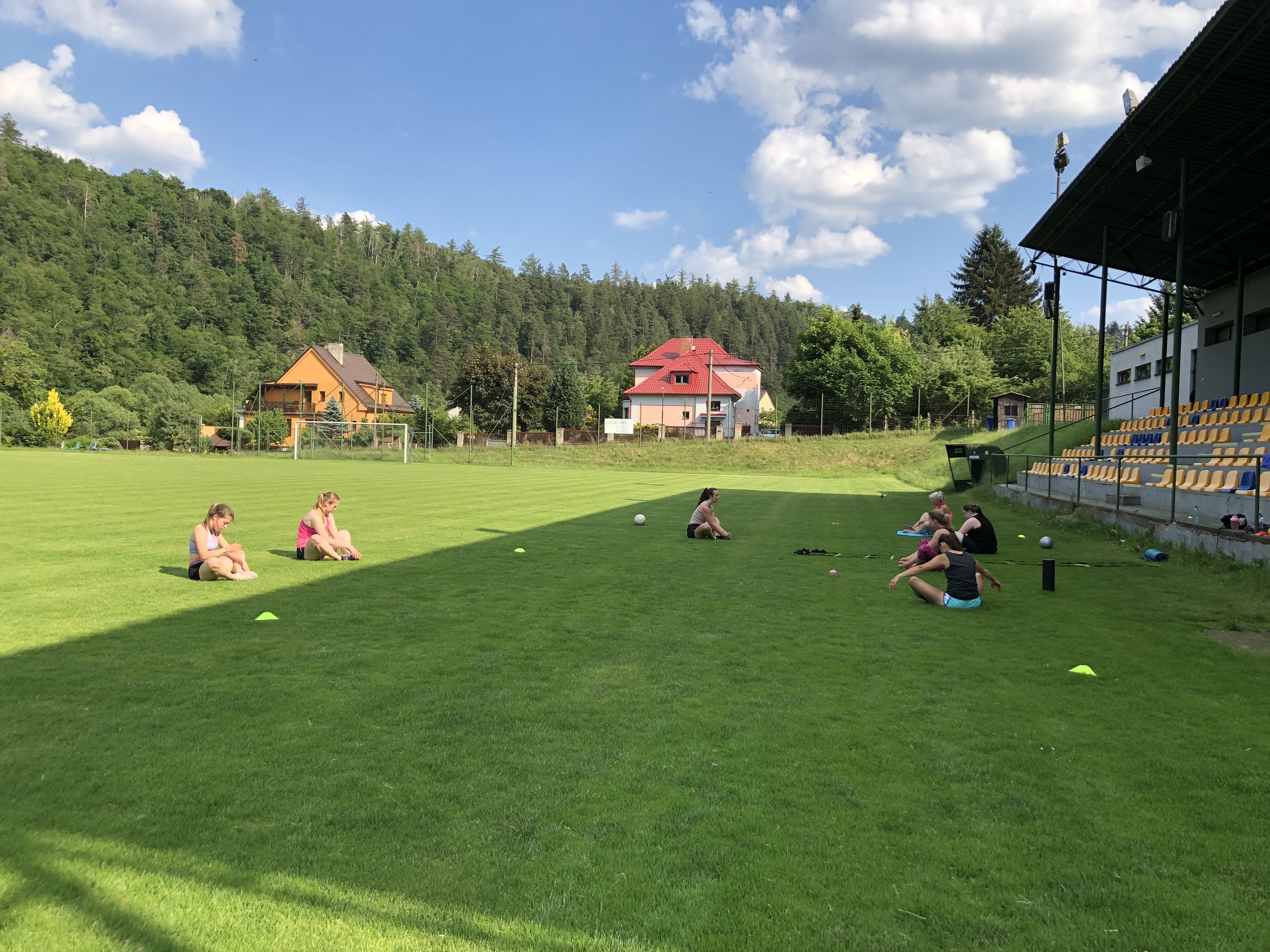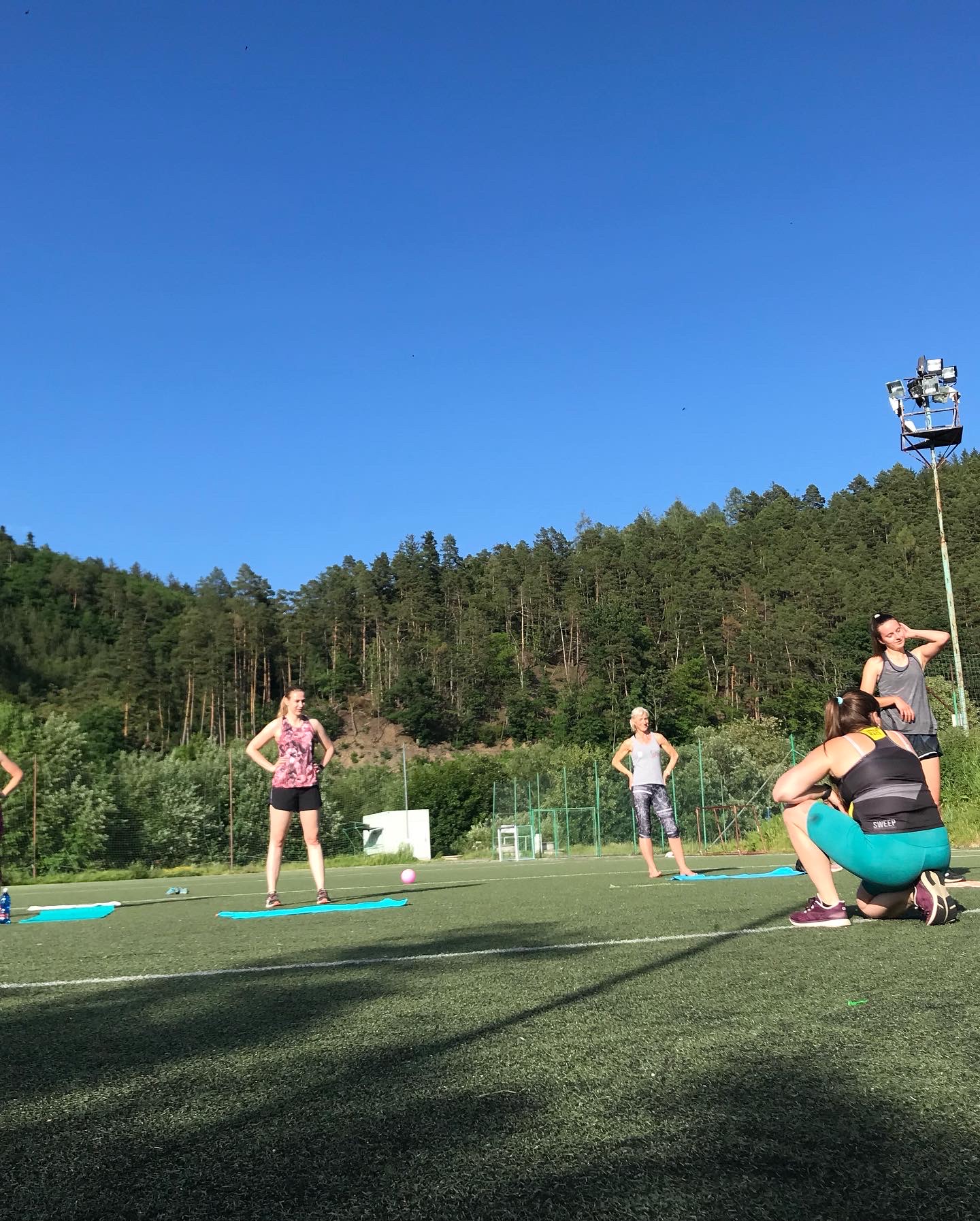 Užily jsme si spoustu tréninků, za celý víkend jsme odcvičily celkem 5 tréninkových jednotek, těžší, lehčí, kratší, delší. Zahájily jsme soustředění večerní lekcí, kdy jsme si zkusily HIIT a LISS cardio na cca 60ti minutové lekci. Každé ráno před snídaní jsme zahajovaly srazem na fotbalovém hřišti, kde jsme si užívaly ranní rosy a ještě né tak horkého počasí. Ranní kratší lekce (30-40min) byla pojata formou regenerace, aby ji na lačno každý zvládl, protáhli jsme se a prokrvily bolavé partie, které povětšinou přestaly bolet. Snídaně probíhaly formou rautu, kde si každá zúčastněná nabrala co má ráda, to je obzvlášť příjemná část dne 🙂 . Před obědem jsme se sešly na hlavní tréninkovou jednotku, která byla nejdelší, trvala cca 75minut. Zahřály jsme se běžeckou abecedou, protáhly a společně prošly 40 minutovým workoutem. Před večeří jsme se sešly na předposlední trénink kempu. Vzhledem k přibývající únavě a bolavým nohám, i přes časté rolování svalů a snaze nacpat do programu co nejvíce regenerace, jsem musela holky trochu namotivovat, protože energie bylo méně a méně, tudíž jsme se zahřály lehkých výběhem, udělaly krátký kruháček na dozahřátí a soutěžily jsme o ceny v hodnotě 1600,-. Vítězky nakonec byly dvě. Holky se neuveřitelně hecovaly a ta atmosféra byla parádní! Každý měl možnost jít podle sebe, buď tam nechat vše a nebo se jen kolektivně zúčastnit. Nakonec se všechny holky dostaly ve workoutu opravdu daleko!