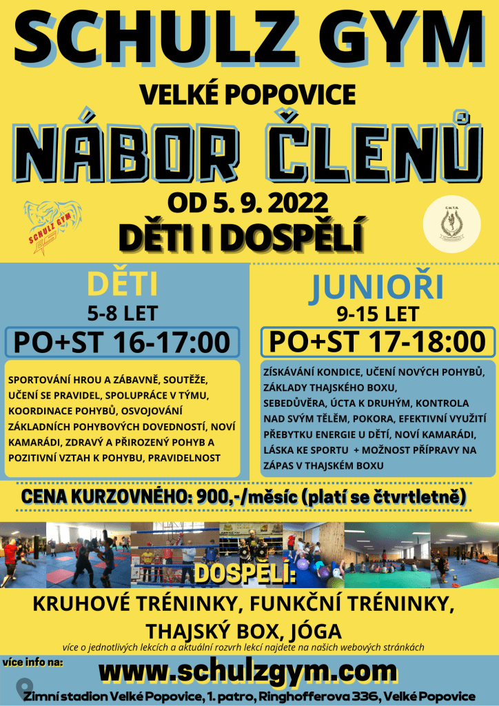Od 1.9.2022 Vás zveme na náš NÁBOR NOVÝCH ČLENŮ, od nejmenších dětí po nejstarší dospělé. Přijďte navštívit naše lekce a zlepšit si formu na zimní měsíce, udělat pro sebe něco zdravého nebo s námi pracovat na vašem zdravém životním stylu. První lekce dětí a juniorů je bezplatná! Přijďte vyzkoušet, přiveďte děti/juniory. S dětmi a juniory startujeme 5.9.2022 a pokračujeme každé pondělí a středu. Dětská kategorie ve věku 5-8 let je vždy v těchto dnech od 16:00 a juniorská kategorie ve věku 9-15 let je v těchto dnech od 17:00.